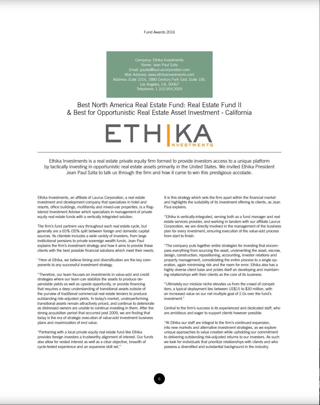 We Invited Jean Paul Szita at Ethika Investments LLC, a real estate private equity firm, to talk us through the firm and how it came to win this prestigious accolade.